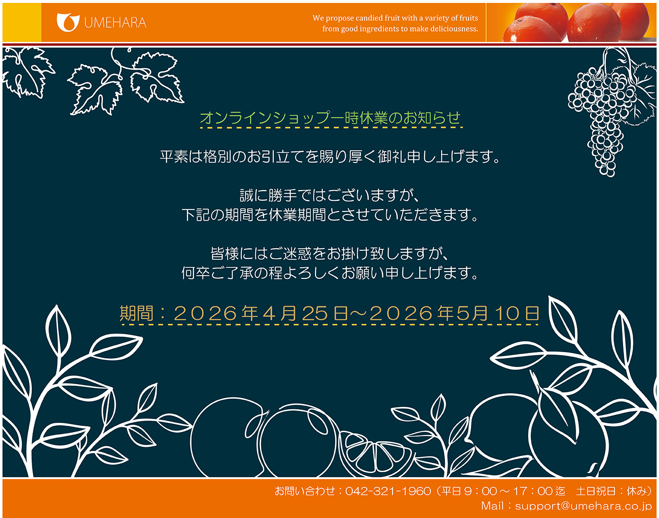 2026年4月25日(土)~2026年5月10日(日)は、うめはら蓼科工場工事の為、休業とさせていただきます。